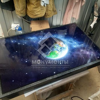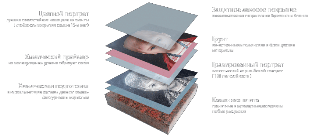 Краткая последовательность изготовления цветного портрета следующая: Сначала на заготовку наносится грунт. На втором этапе в него вживляются краски. Затем воспроизводится живопись и осуществляется деталировка. На каменной поверхности рисунки держатся превосходно – не покрываются трещинами и не теряют насыщенности цвета.