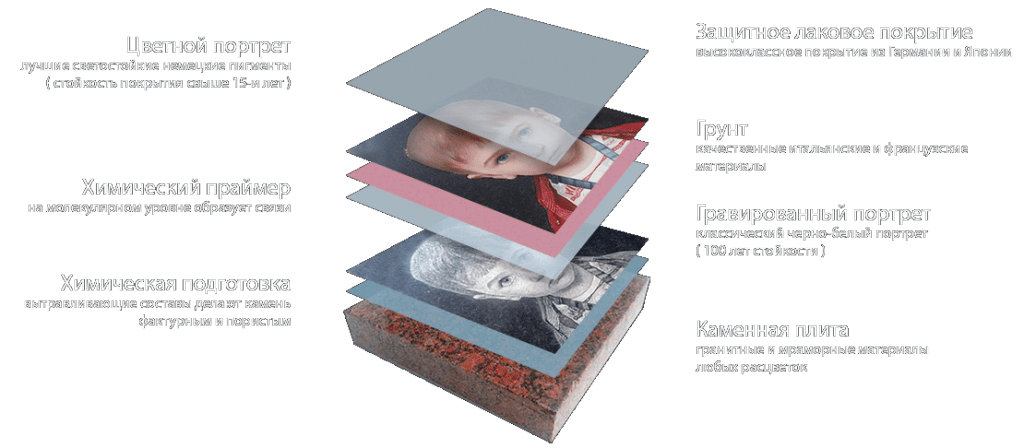 Краткая последовательность изготовления цветного портрета следующая: Сначала на заготовку наносится грунт. На втором этапе в него вживляются краски. Затем воспроизводится живопись и осуществляется деталировка. На каменной поверхности рисунки держатся превосходно – не покрываются трещинами и не теряют насыщенности цвета.