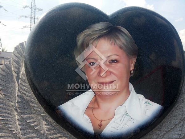 Этот цветной портрет выполнен на памятнике из красивого зеленого камня — «Змеевик». Предварительно был подготовлен индивидуальный эскиз и коллаж портрета. По причине низкого качества исходной фотографии, было принято решение, написать портрет преимущественно мазками.