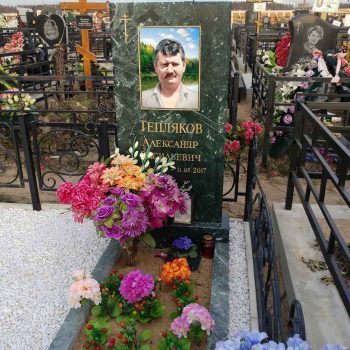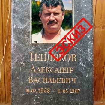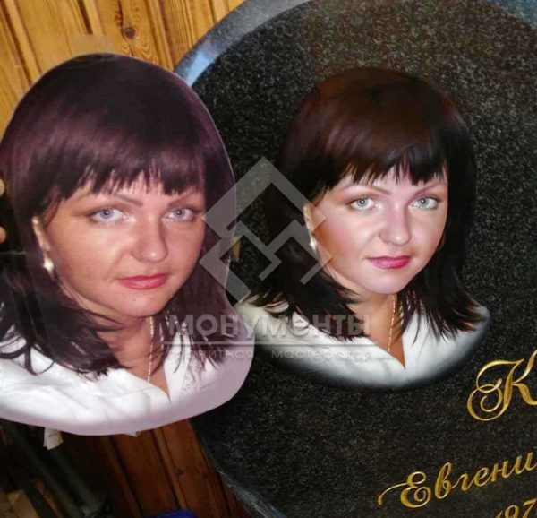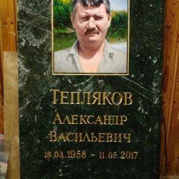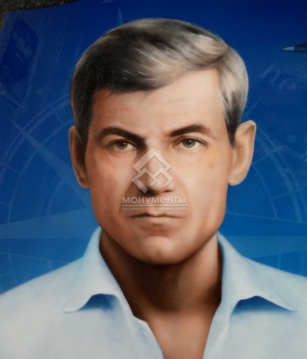 Этот цветной портрет выполнен на памятнике из красивого зеленого камня — «Змеевик». Предварительно был подготовлен индивидуальный эскиз и коллаж портрета. По причине низкого качества исходной фотографии, было принято решение, написать портрет преимущественно мазками.