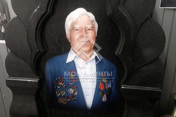 Изготовили необычное надгробие в виде гор из двух стел. Памятник лыжнику выполнен из самого распространенного гранита — «Габбро-Диабаз». Цоколь выполнен в общем стиле комплекса.
