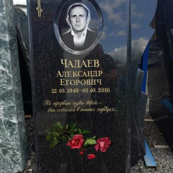 Классический надгробный памятник из черного камня. В селу вмонтирован портрет на керамике, вырублены буквы в глубину и покрыты краской. Цветы написаны красками по уникальной технологии!